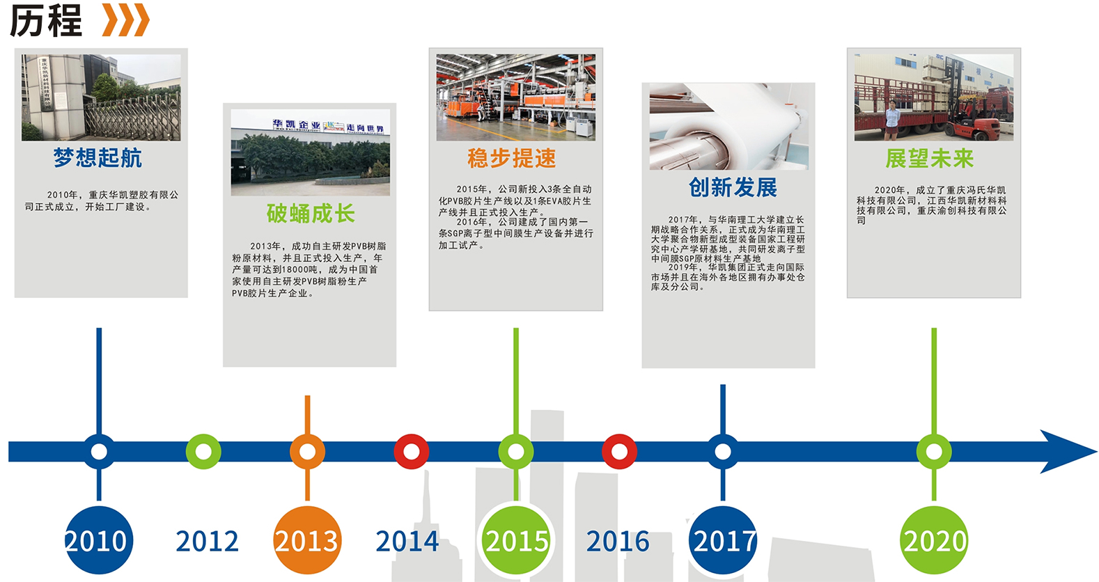 重慶華凱塑膠有限公司于2014年3月13日正式注冊(cè)成立,占地面積56000平方米,廠房面積35000多平方米,固定資產(chǎn)7300余萬元,總投資1億3千萬元人民幣;是重慶市PVB樹脂、PVB膠片,SGP膠片,EVA膠片,HUD楔形PVB膠片玻璃中間膜專業(yè)制造企業(yè)。